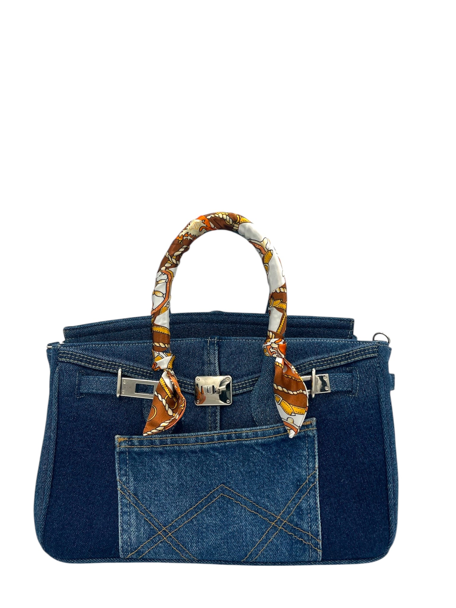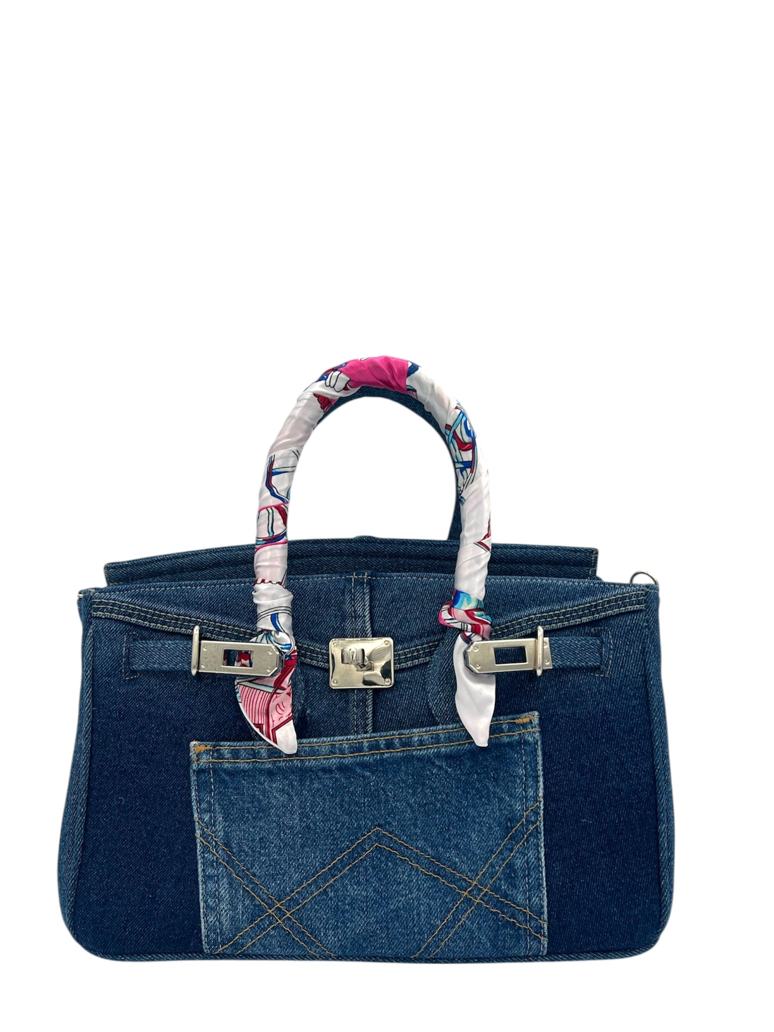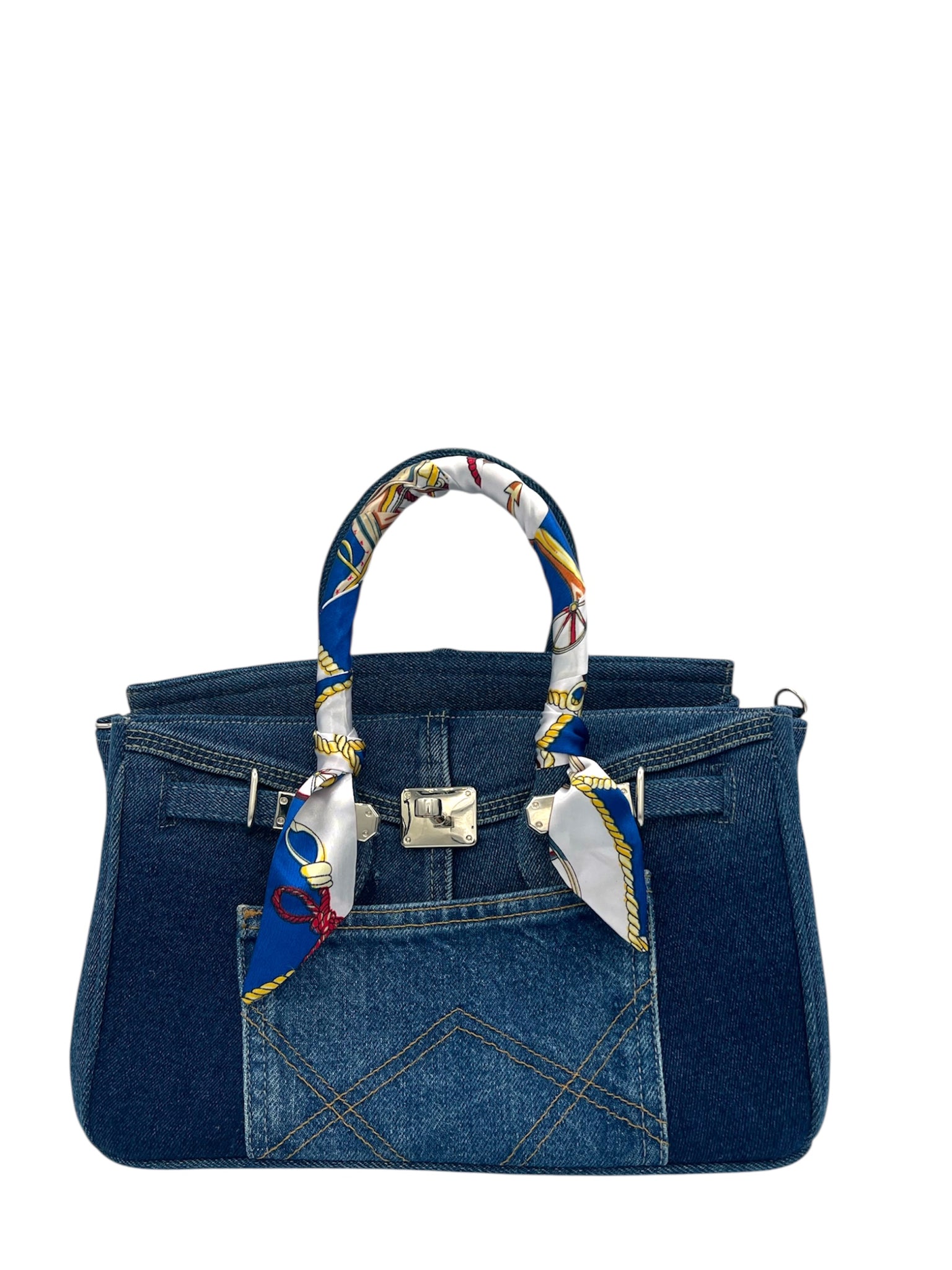 Brigitte denim collection in size small. This luxurious handbag is big enough for everyday wear. Made from repurposed denim. Each piece is unique. The bag comes with bandana on the handles. You may purchase a set of printed scarves for the handles for a more sophisticated look! The bag comes with a strap for wearing crossover or on shoulder. An Iconic design and style you will wear forever!