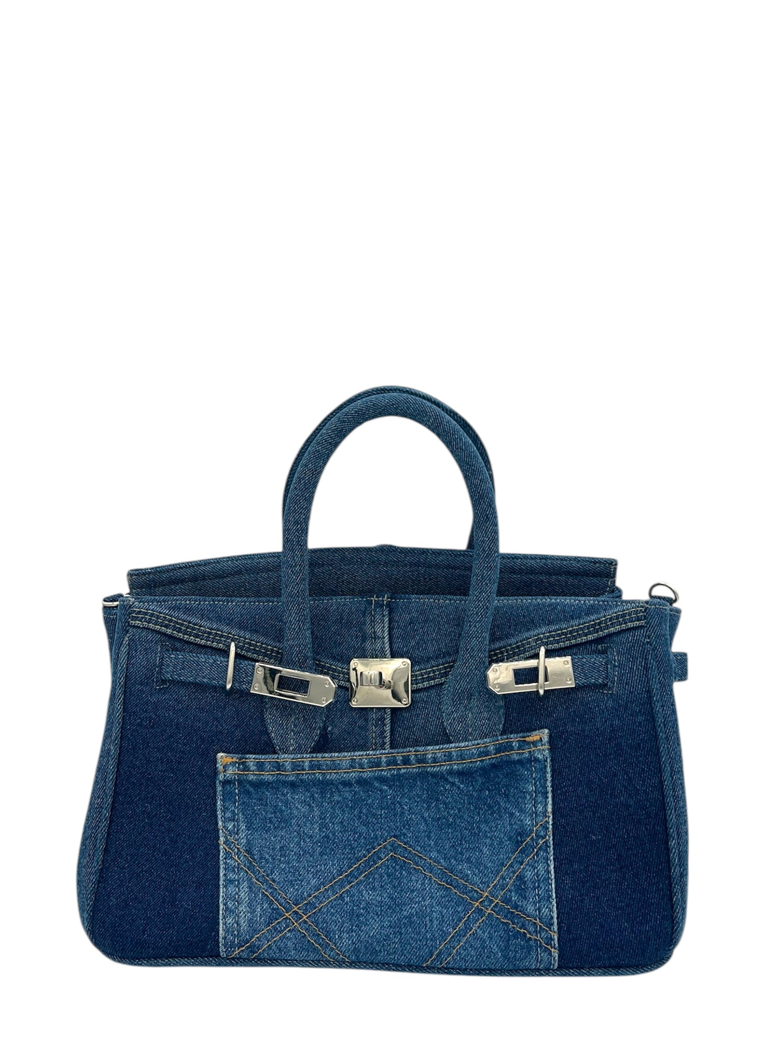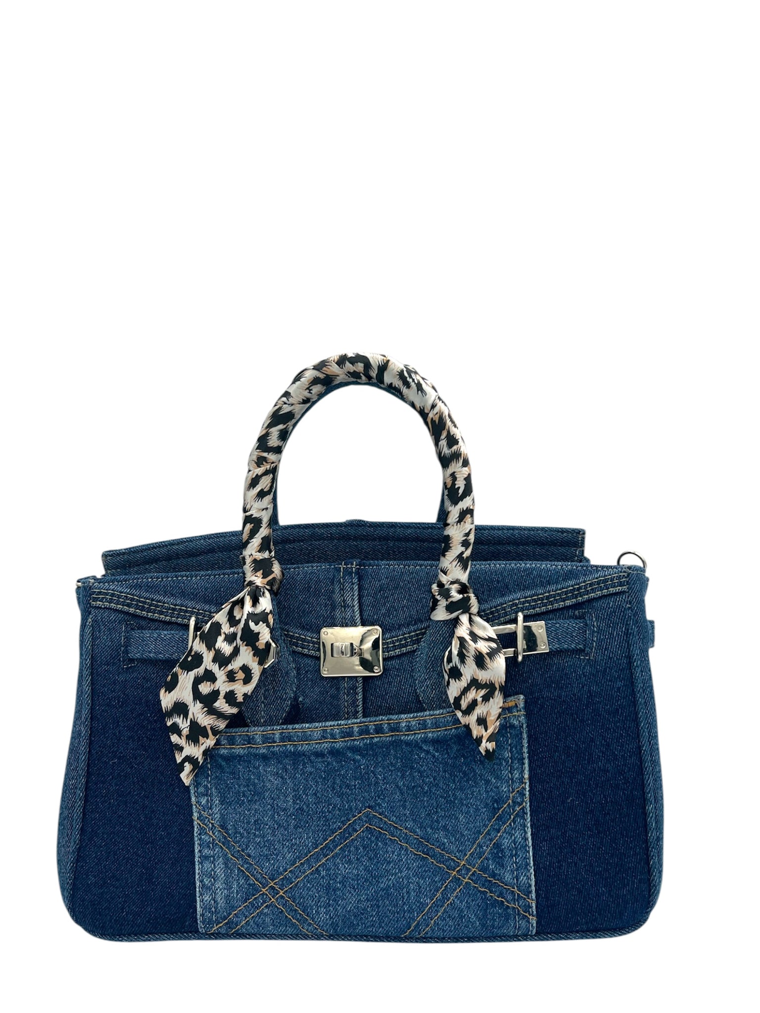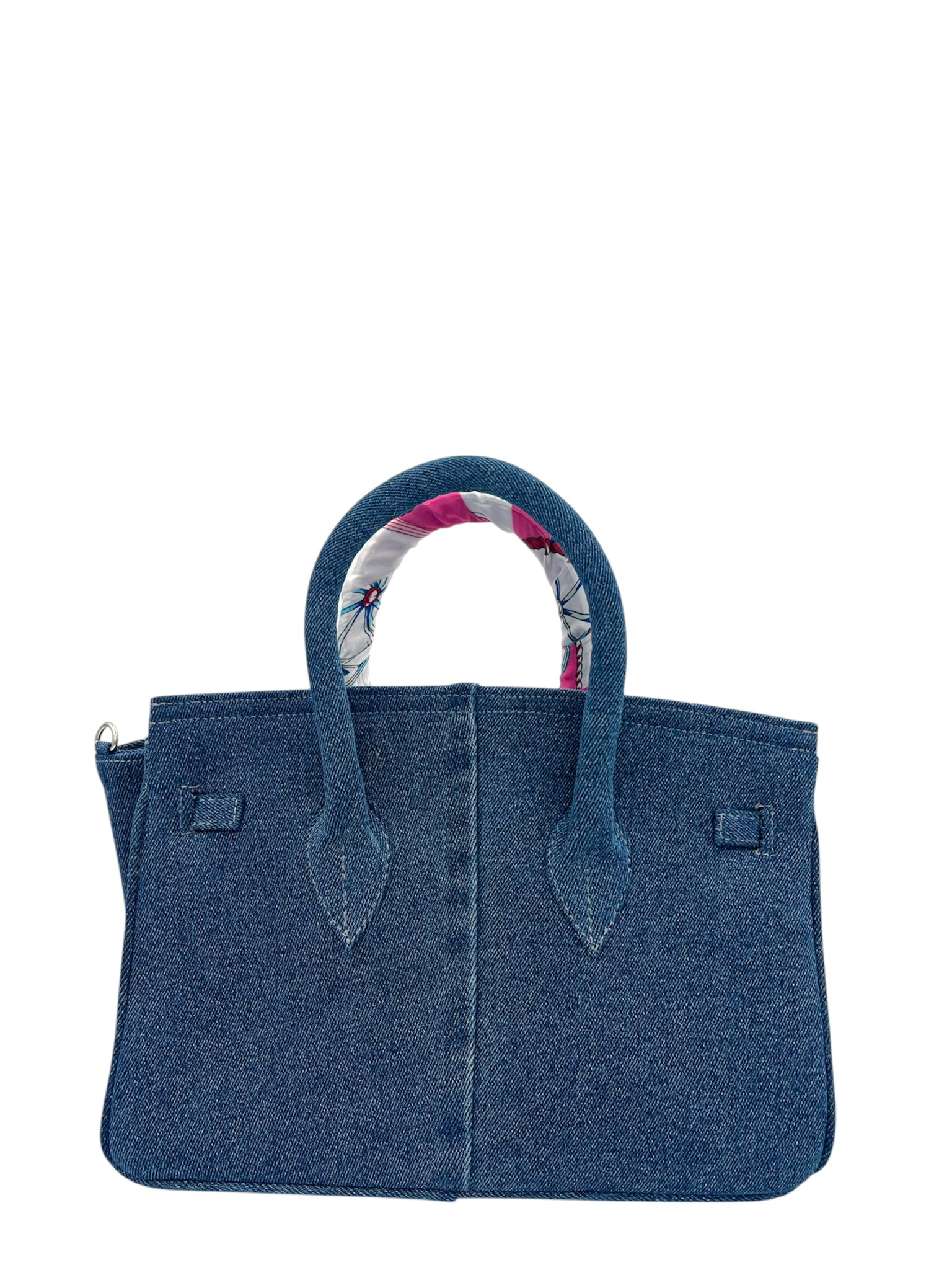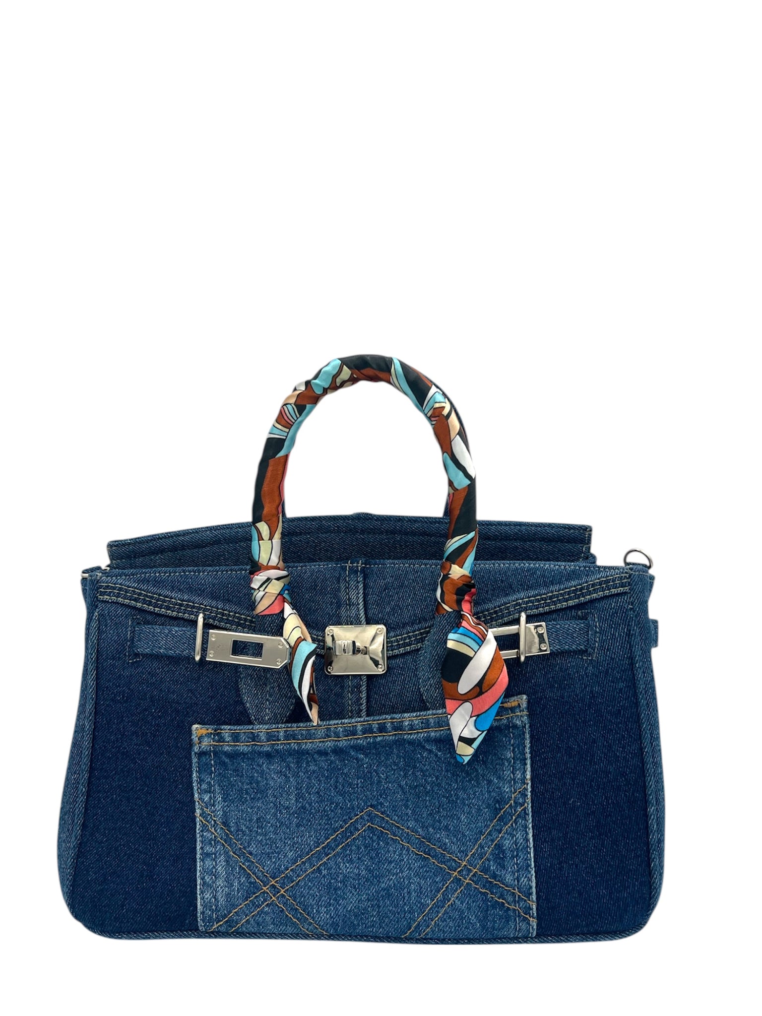 Brigitte denim collection in size small. This luxurious handbag is big enough for everyday wear. Made from repurposed denim. Each piece is unique. The bag comes with bandana on the handles. You may purchase a set of printed scarves for the handles for a more sophisticated look! The bag comes with a strap for wearing crossover or on shoulder. An Iconic design and style you will wear forever!