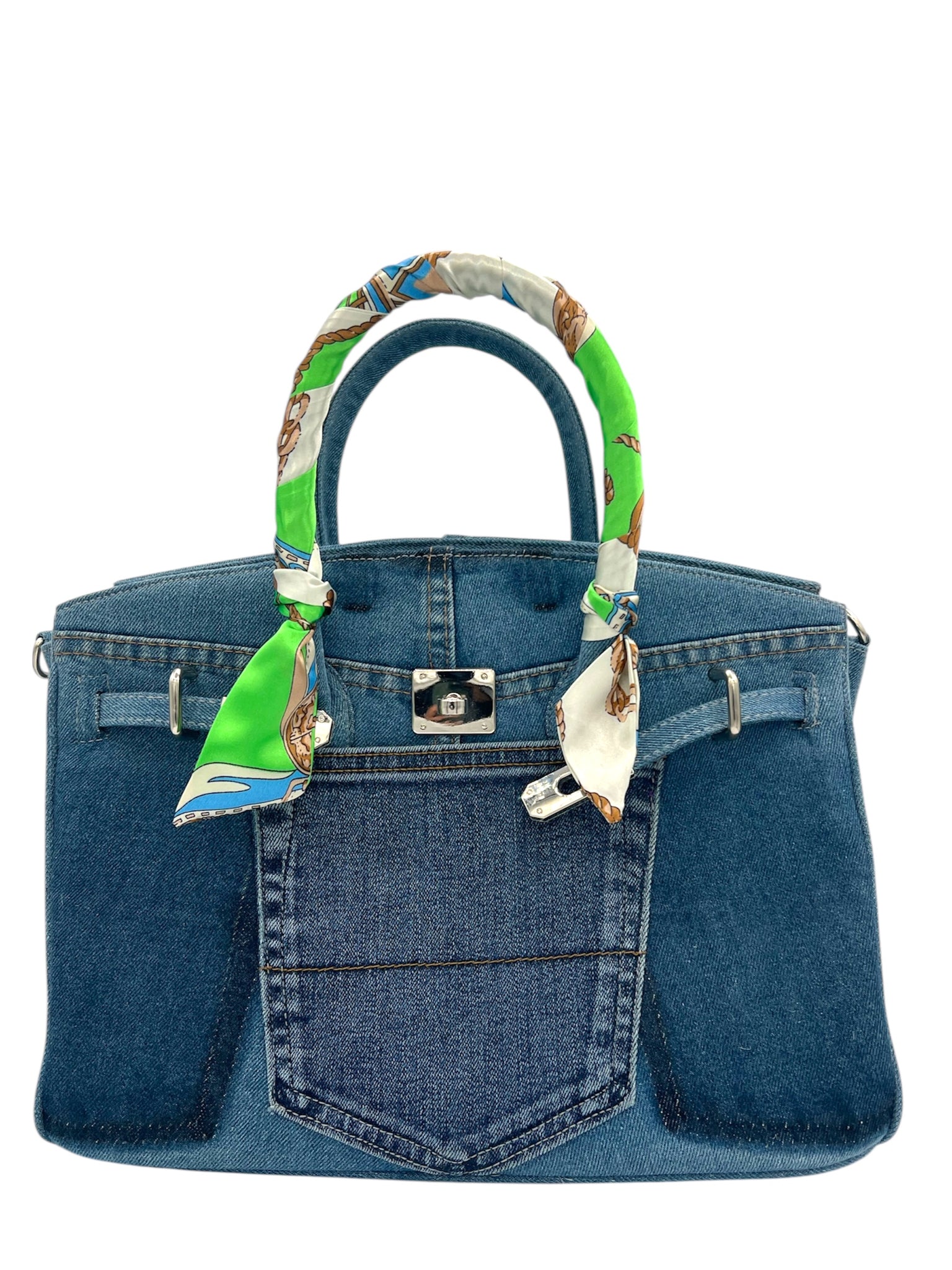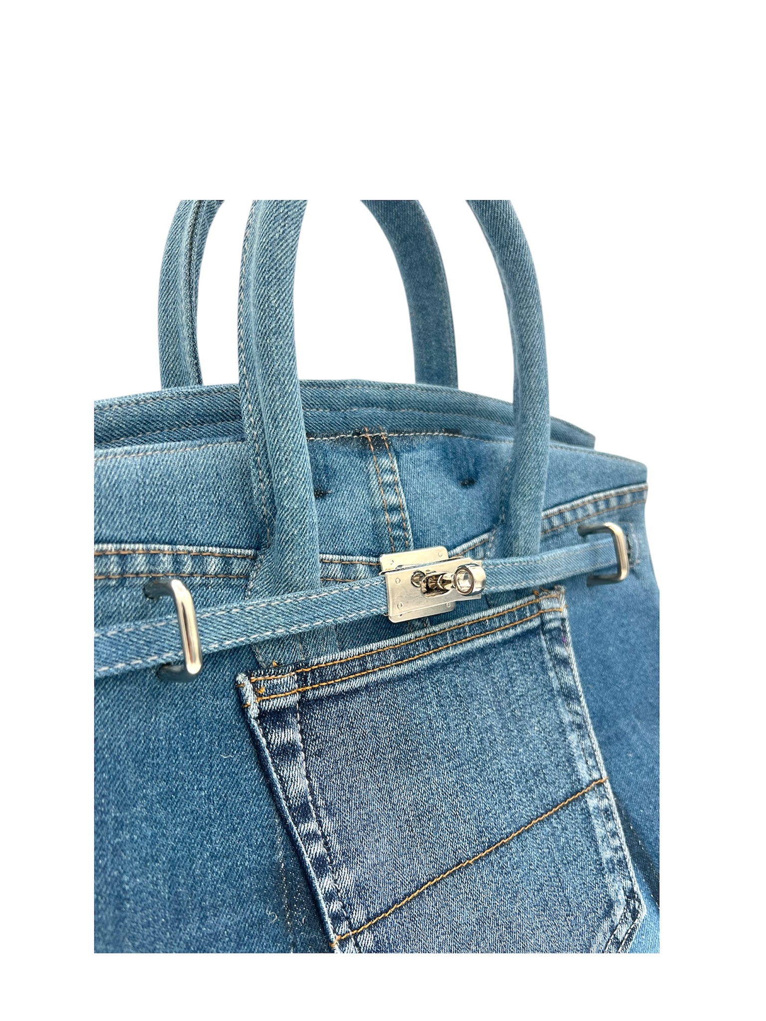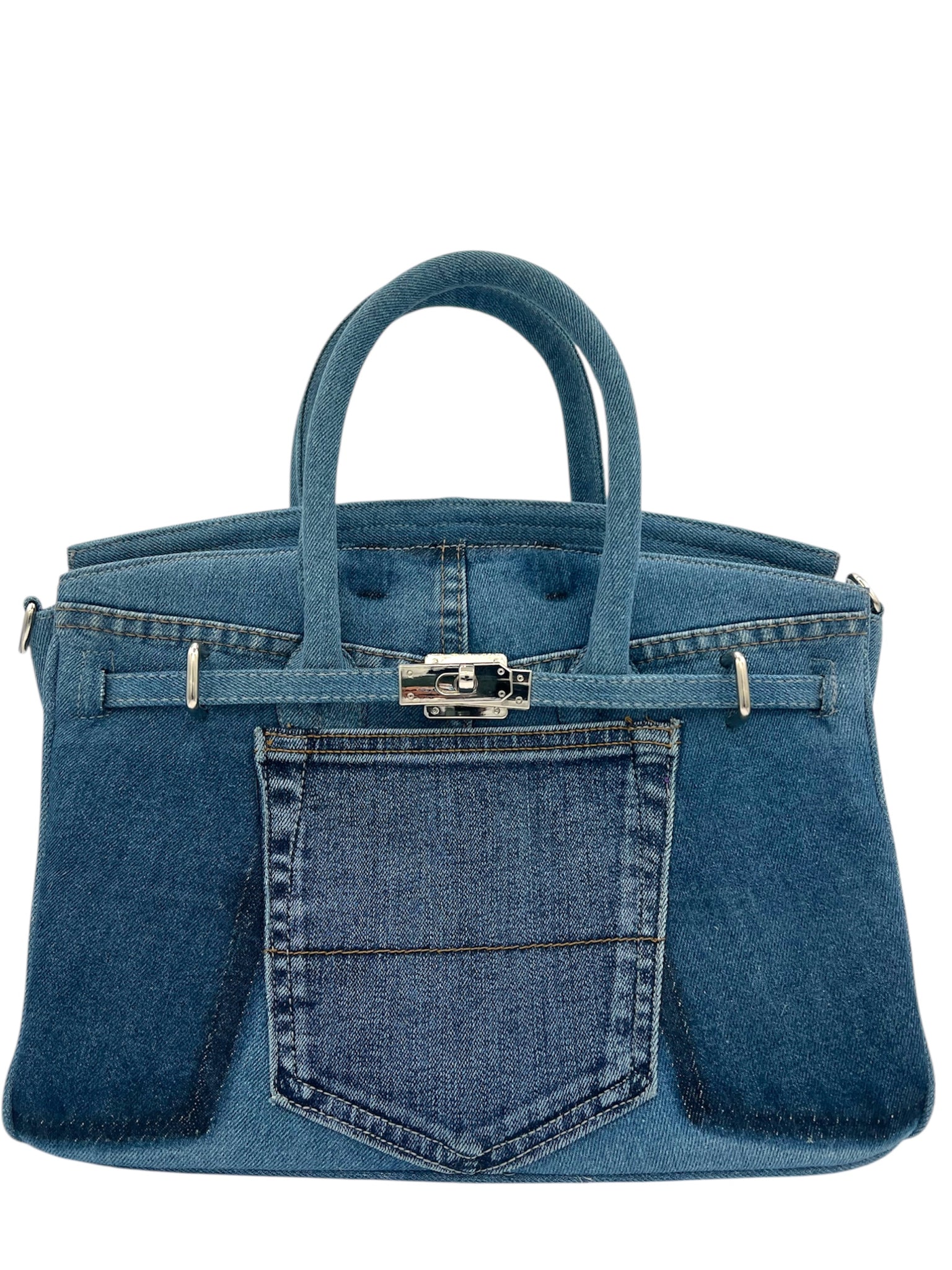 The Brigitte bag in denim brings you a timeless look with an edge of sustainable luxury. Made of repurposed denim with a pocket detail in front. Medium size , lined in white or navy cotton, comes with denim strap and dust bag. Measures 14" length x 10" height x 7" depth.