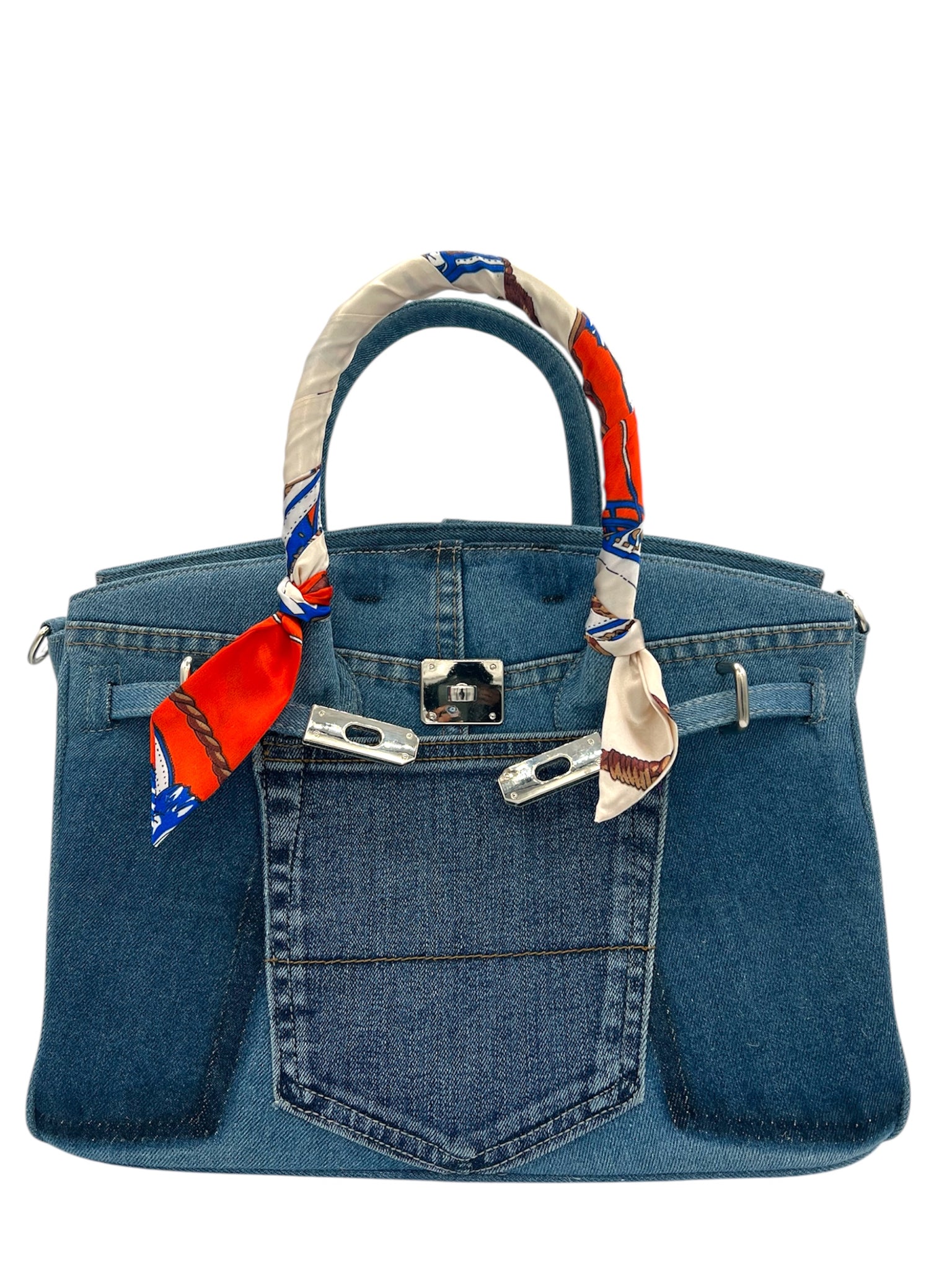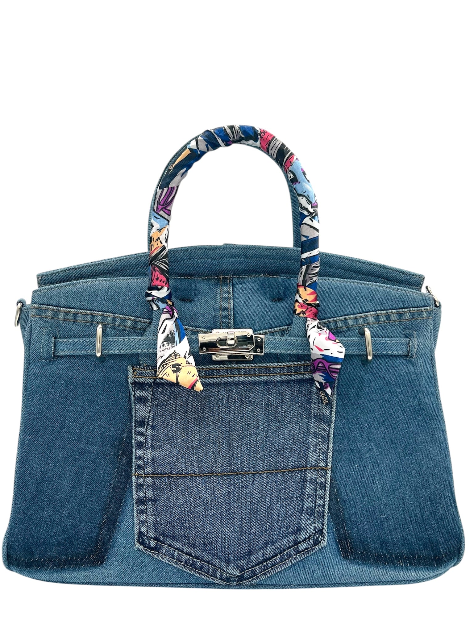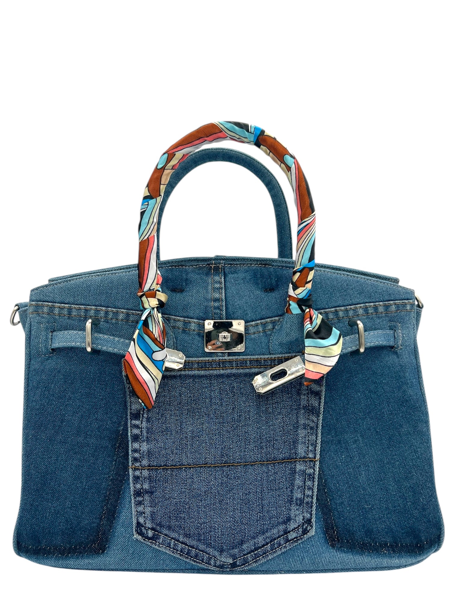 The Brigitte bag in denim brings you a timeless look with an edge of sustainable luxury. Made of repurposed denim with a pocket detail in front. Medium size , lined in white or navy cotton, comes with denim strap and dust bag. Measures 14" length x 10" height x 7" depth.